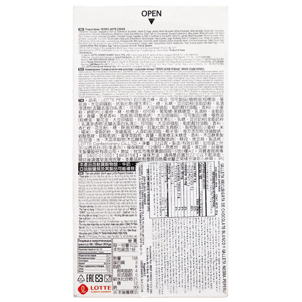 Dulce coreano hecho de galleta en forma de bastón, con cubierta de chocolate blanco con trocitos de galleta negra.