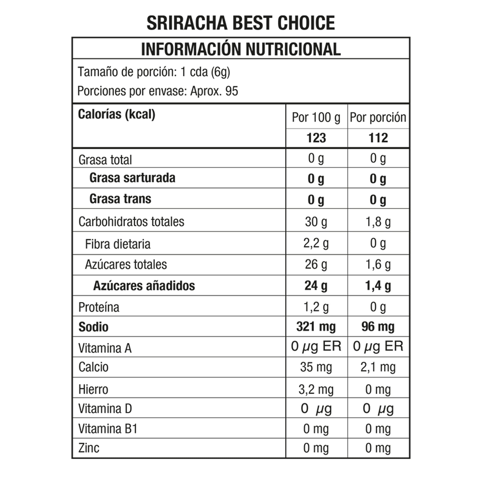 Te presentamos nuestra Sriracha Best Choice, una salsa de ají estilo tailandés con el equilibrio perfecto entre picante y dulzura. Su sabor vibrante realza salteados con pollo, cerdo, mariscos y verduras, además de ser ideal para sushi picante, sopas, ramen y aderezos. Con un nivel de picante moderado, es fundamental en la cocina para quienes buscan intensidad y autenticidad en cada bocado.
